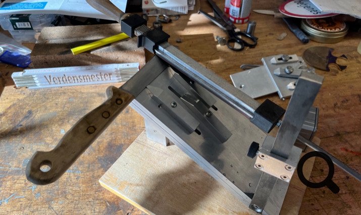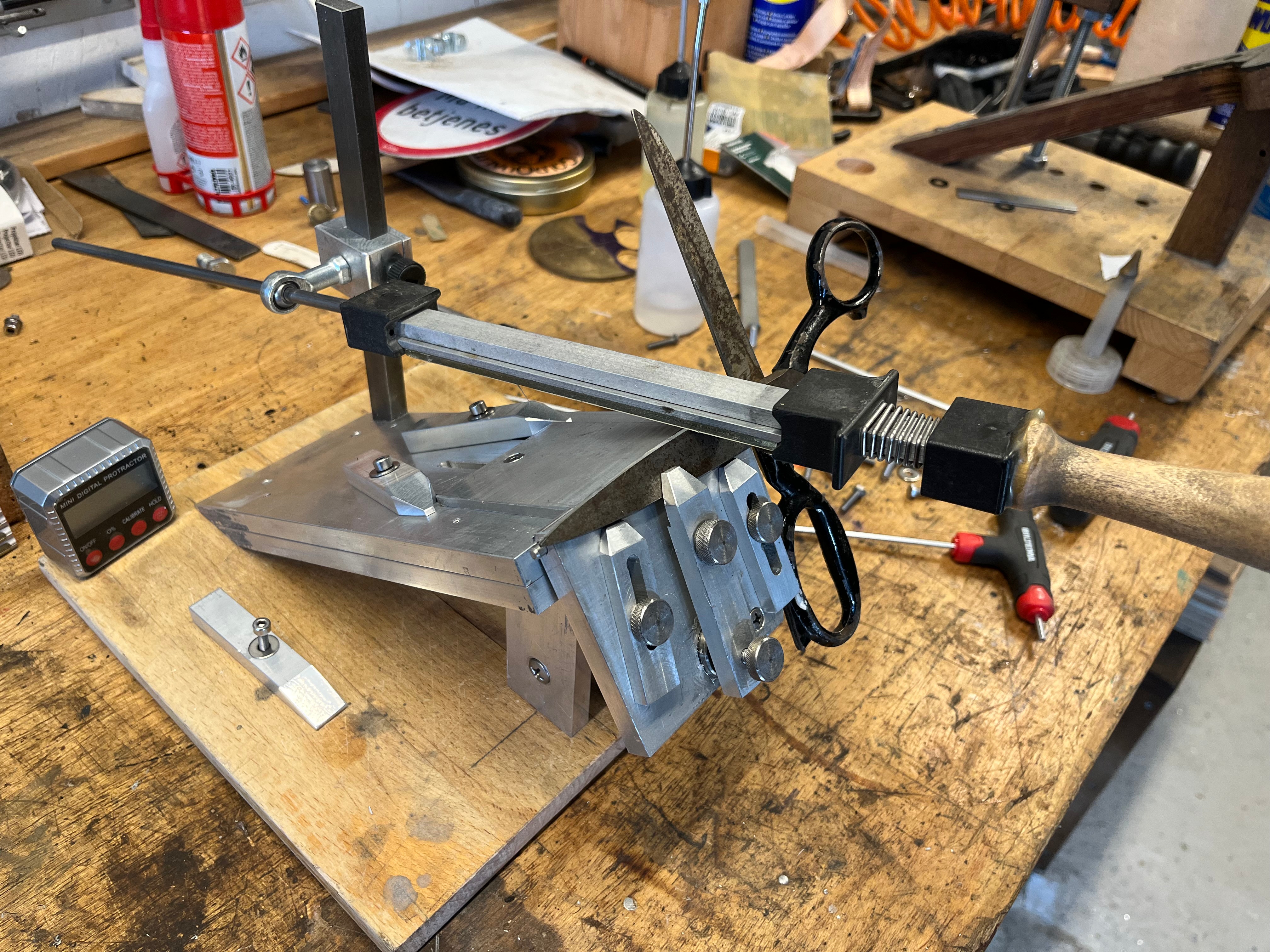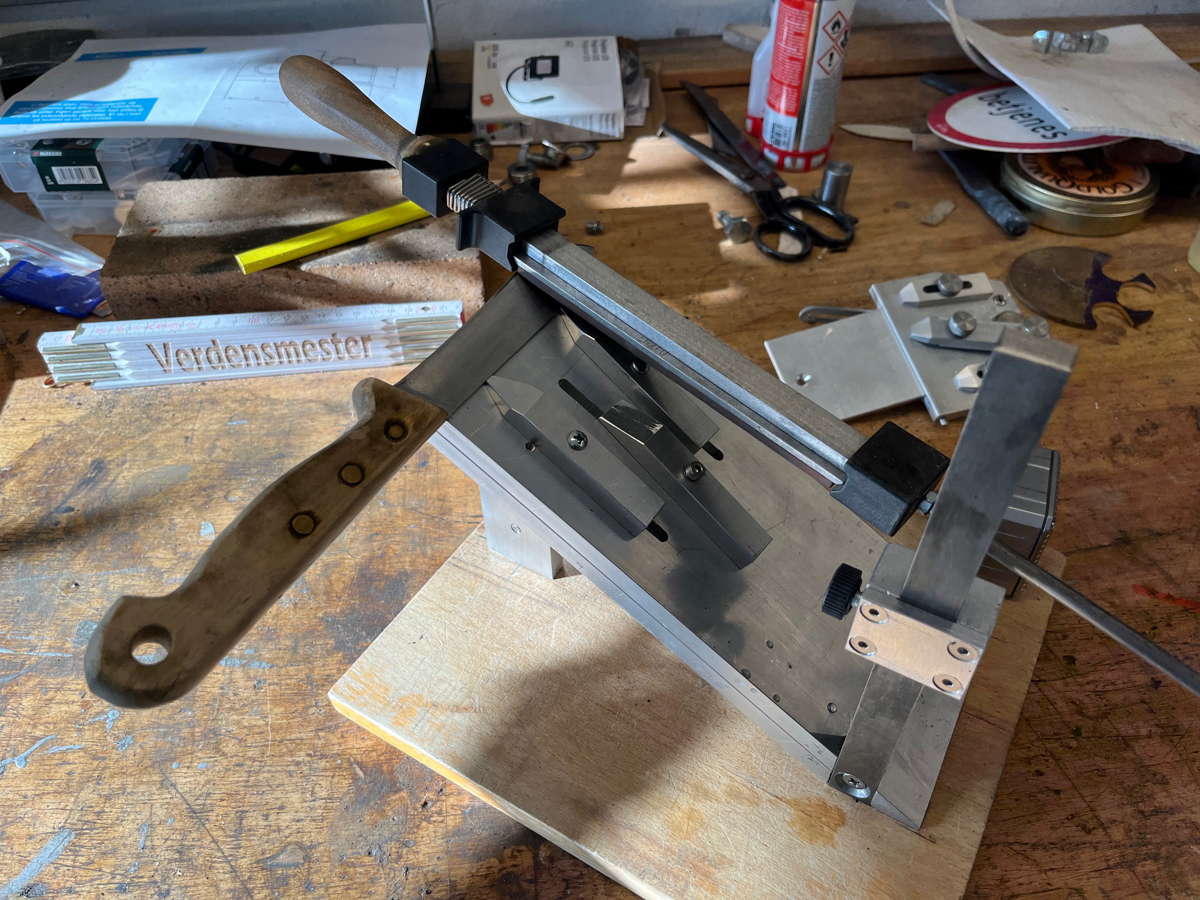 Jeg sliber knive og sakse på min præcisionsknivsliber der sikrer at begge sider af skæret altid er i den samme og den rigtige vinkel